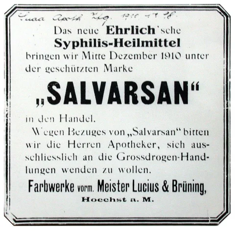 Долгое время не было препаратов, которые могли излечить сифилис полностью. Лечение могло лишь замедлить его развитие. Обычно шли в ход препараты на основе ядовитой ртути, которые втирались в ноги пациентов. В 1880-х стали использоваться соли висмута, которые считались менее токсичными, чем ртуть. А в 1910 году появился препарат «Сальварсан 606», который считался первым по-настоящему эффективным средством против сифилиса. Пауль Эрлих работал над его созданием ещё с 1906 года, и для этого проводил многочисленные опыты с мышьяком, среди которых 606-й, наконец, увенчался успехом. Эрлих в 1908 году получил Нобелевскую премию, правда, за исследования в области иммунологии, а не за сей прославленный препарат. «Сальварсан» дословно переводится как спасительный мышьяк. Мышьяк тоже давал побочные эффекты, поэтому опыты были продолжены. Употребление «Сальварсана» провоцировало выкидыши и вело к бесплодию.