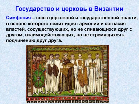 Симфония (греч.συμφωνία «согласие») концепция в православной христианской богословской и политической мысли, особенно в Восточной Римской и в Российской империях, которая утверждает, что церковь и государство должны дополнять друг друга, проявляя взаимное уважение, при этом ни одно из учреждений не должно претендовать на доминирование над другим.