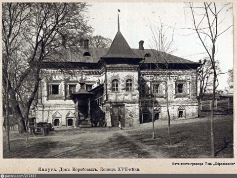 Палаты и усадьба Коробовых впервые упоминаются в «Раздельной записи детей и внуков Кирилла Ивановича Коробова» в 1697 году. Палаты принадлежали земскому старосте, купцу 2-ой гильдии Кириллу Ивановичу Коробову, который торговал солью, хлебом и пенькой не только в Калуге, но и в городах средней полосы России. Дом в то время находился в отдалении от города «за оврагом». Раньше здесь было лишь несколько бедных домиков. Дом стоял в глубине участка, рядом амбар для соли с навесом, а за домом сад, в нём сенник и «клеть хлебная». Возведенный в стиле древнерусского зодчества или бело-красного «нарышкинского» барокко, популярного некогда в столице, дом Коробова имел два этажа. Первый каменный, второй деревянный. На второй этаж можно было попасть по нарядной лестнице с крыльцом. Под домом находились огромные погреба, в которых помещались хозяйские товары. Но была еще и комната «с секретом», попасть в которую можно было лишь через потайную дверь с верхнего этажа. Утверждают, что в ней хозяин хранил на жердях, служивших подобием вешалок, одежду и ценные меха.