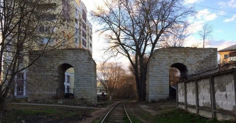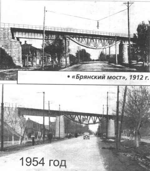 Один из них стоял над нынешней улицей Ленина, дорога проходила внутри квартала. Этот мост входил в состав бывшей «калужской петли» - кольцевой железнодорожной ветки, окончательно разобранной при строительстве первых троллейбусных линий в 1954–55 годах, когда железная дорога и мост были разобраны, насыпи срыты, а «быки» остались.