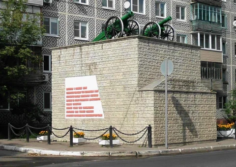 С другой стоят точные копии пушек времен Отечественной войны. «Пушки» – такое название дали монументу калужане, и эти пушки «побывали в бою»: их использовали во время съемок картины «Война и мир» в 1967 году.