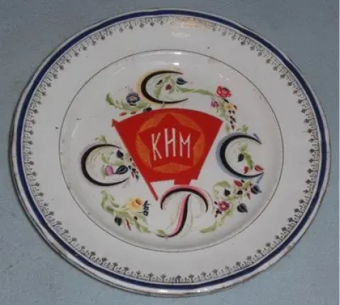 Самый ранний образец агитационного песоченского фаянса — настенное памятное блюдо, посвященное пятилетию профессионального союза рабочих-химиков. Его изготовили в подарок Брянскому губернскому отделу профсоюза. В центре медальона изображены корпуса завода, дымящие трубы, которые возвышаются на фоне восходящего солнца. В нижней части блюда — предметы, необходимые химикам для работы: колбы, пузырьки, отливки тарелок.