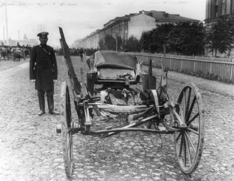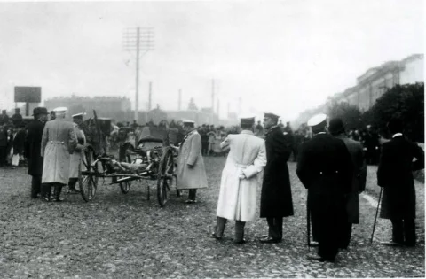28 июля 1904 года боевик Егор Сазонов, увидел карету министра, когда Плеве ехал в Петергоф для доклада Николаю II, и шагнув на проезжую часть бросил бомбу в цель. Шансов на спасение у Плеве не было.