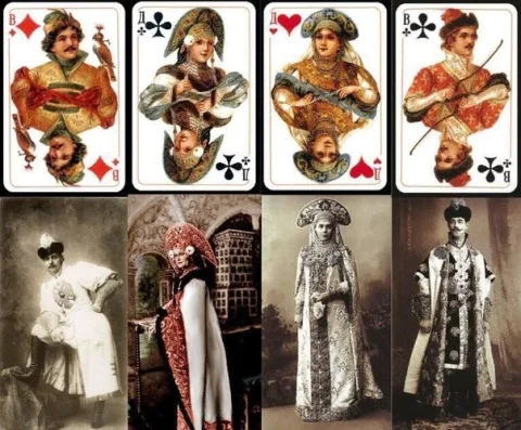 «…3 августа 1917, Царское Село. На станциях закрывали занавески на окнах, чтобы нас никто не видал. Обедал в 8 ч. с мама в купэ и с ней же завтракал. В 1/2 8-го гуляли около реки Сылвы с массами солдат. Играл в карты. 4 авг. проснулся поздно. Завтракал у мама в купэ с ней. Играл в карты и гадал на себя и на других. Гуляли 1/2 часа около железной дороги. В 11 ч. мы все сели на пароход “Русь…” А в 1913 году в России была издана колода "Русский стиль", придворные карты которые придумали братья и сестры императора и императрицы.