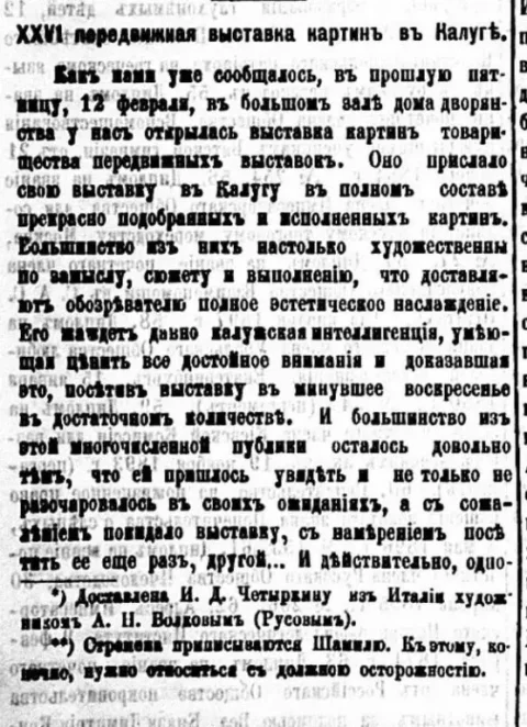 12 февраля 1899 года в залах Дворянского собрания открылась 26-я передвижная выставка. Для прославленного Товарищества передвижных выставок она была 26-й по счету. Для Калуги — самой первой.Именно ею началась длинная череда художественных выставок, организовывавшихся и организуемых в нашем городе, в нашем крае.В экспозиции находились работы — пусть и не лучшие — наизнаменитейших живописцев: И. Е. Репина, И. И. Левитана, В. Д. Поленова, М. В. Нестерова…Гвоздем же выставки считалась «Корабельная роща» И. И. Шишкина. Интересно, что на выставке была представлена и картина Н. А. Ярошенко «Кратер Везувия» — этот огромный пейзаж хранится ныне в фондах Калужского областного художественного музея.