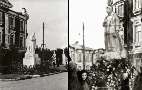 А первый бюст защитнику Родины в Калуге появился в 1948 году. На месте разрушенной Благовещенской церкви был создан сквер им. Карпова, где было высажено более двадцати 30-летних лип, а коллектив артели «Метширпром», изготовил красивую ограду, а за два воскресника здесь отработало 800 человек. Когда начали копать котлован для фонтана, мешал фундамент храма, кладка которого оказалась такой прочной, что было принято решение засыпать землей весь периметр фундамента храма. Поэтому мы и сегодня видим, что центральная часть сквера приподнята. По окончании всех работ, на постаменте из финского розового гранита, был установлен бронзовый бюст дважды Героя Советского Союза Александра Терентьевича Карпова.
