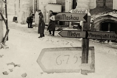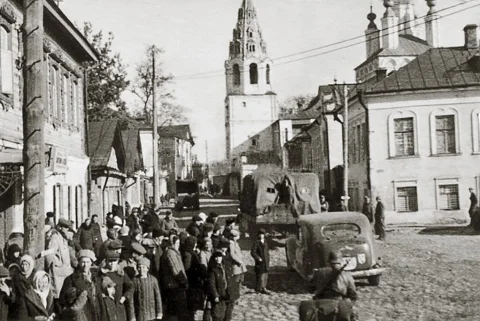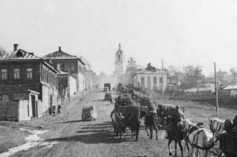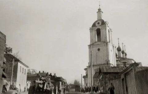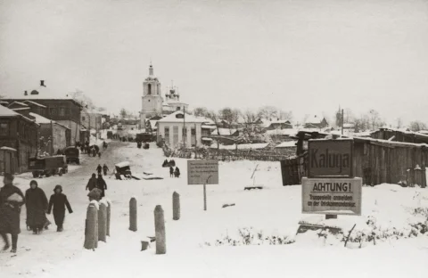 Затем начались орудийные обстрелы города, а за день до оккупации, в Калуге, наши взорвали водонапорную башню, электростанцию, подожгли элеватор на Малинниках, и цеха заводов. Весь город был в страшном дыму, и 12 октября фашисты вошли в Калугу. Расхожий миф, что перекрёстке улиц Пушкина и Баумана калужане встречали немцев хлебом-солью, был придуман позже. На самом деле в это время проходил большой крестных ход верующих рядом с храмом Георгия за верхом, единственной церковью, которую не закрыли до войны. Крестный ход был посвящен Иерусалимской иконы Божией Матери, которая находилась ( и сейчас находится) в этом храме .