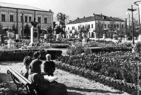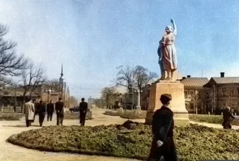 После войны бывшая Театральная площадь (сквер Мира), была расчищена от руин сгоревшего городского театра, и на ней был разбит сквер. В центре сквера была установлена скульптура «Нет войне», в виде фигуры женщины и ребёнка. Эта скульптура простояла в центре сквера до 1957 года, когда было принято решение установить там памятник Циолковскому, и эту скульптуру перенесли в городской парк культуры и отдыха.