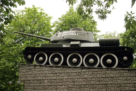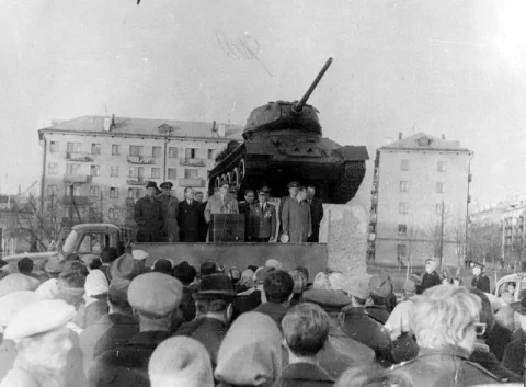 29 декабря 1966 года, в канун празднования 25-летия освобождения Калуги от немецко-фашистских захватчиков, в сквере ветеранов, созданном трудами коллектива КТЗ, ( в то время сквер Глаголева), состоялся торжественный митинг, в ходе которого был заложен памятный камень, на месте будущего памятника воинам частей Красной Армии, освободившим наш город в конце декабря 1941 года. Тогда же было принято решение, что здесь будет поставлен на пьедестал танк Т-34. И настоящий легендарный танк Т-34/85, который своим ходом прибыл из подмосковной танковой части, появился на постаменте через год. Открытие памятника состоялось 5 ноября 1967 года. Интересен тот факт, что на постамент танк заехал своим ходом. Более того, внутри все силовые агрегаты на месте, и если их привести в порядок, и завести двигатель, этот тяжеловес будет полностью боеспособен.