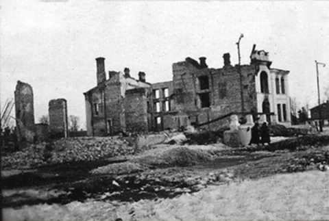Это здание просуществовало до 1941 года, когда при при отступлении, немцы уничтожили здание, видно что сгорела деревянная часть