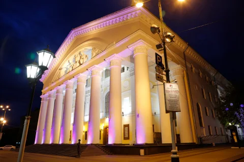 После войны сразу же был объявлен конкурс на лучшее размещение нового театра, и первое место занял академик архитектуры И.В. Жолтовский, предложивший построить театр на бывшей площади Новый торг (ныне Театральная площадь).