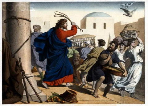 Иисус пришел в Иерусалим и нашел, что в храме продавали волов, овец и голубей, и сидели меновщики денег. И, сделав бич из веревок, выгнал из храма всех, также и овец и волов; и деньги у меновщиков рассыпал, а столы их опрокинул. И сказал продающим голубей: возьмите это отсюда и дóма Отца Моего не делайте домом торговли (Ин 2:13–16).