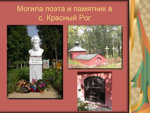 В преклонном возрасте у Алексея Константиновича были серьезные проблемы со здоровьем, и 28 сентября 1875 года, во время сильнейшего приступа головной боли, Толстой ввел себе морфий, который принимал по предписанию врача, но не рассчитал дозу и заснул навсегда в своем имении Красный Рог, где его и похоронили.