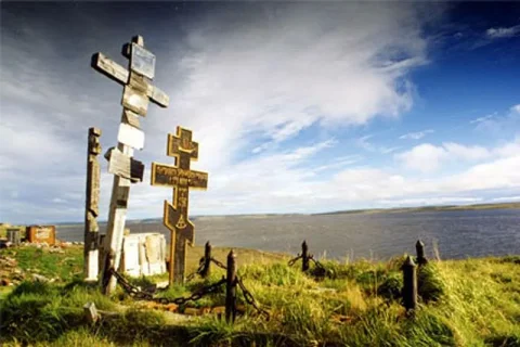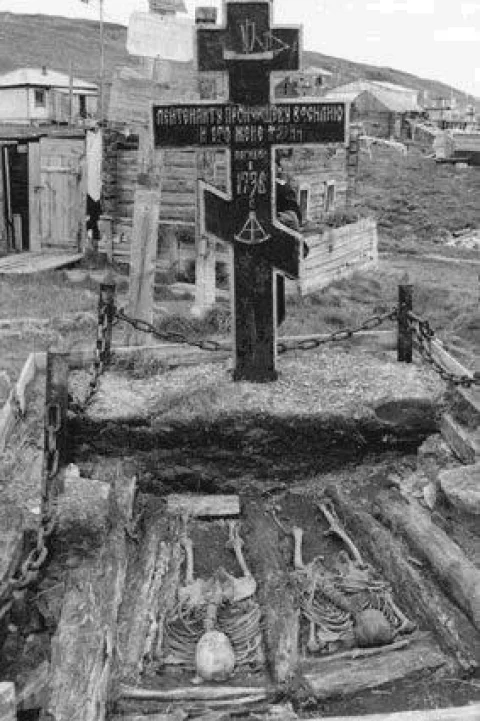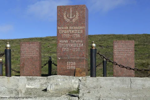 «29-го 1736 года Прончищев скончался, а 2-го сентября, наконец, вошли в устье Оленёка, по которому уже несло лед, и остановились у прошлогоднего зимовья. 6-го предали земле тело покойного командира, а пять дней спустя (11-го), за ним последовала и жена его, погребенная вместе с ним…»