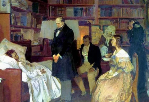 Александр Пушкин умер в 14 часов 45 минут 29 января 1837 года (10 февраля по новому стилю) после тяжких страданий. В предсмертные часы он оглядел книжные шкафы, и прошептал: «Прощайте, прощайте». Затем попросил Даля и Данзаса поворотить его на другой бок, которые и исполнили его волю: слегка поворотили его и подложили к спине подушку.