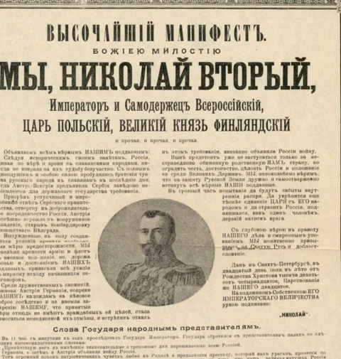Согласие на всеобщую мобилизацию Николай 2 дал 17 июля, и в Генштаб, а затем в военные округа пошла телеграмма за подписью военного министра Сухомлинова, военного министра Григоровича, и министра внутренних дел Маклакова: "Высочайше повелено привести армию в военное положение, и для сего призвать чинов запаса и поставить лошадей, согласно мобилизационному расписанию 1910 года. Первым днём мобилизации следует считать 18 сего июля 1914 года."
