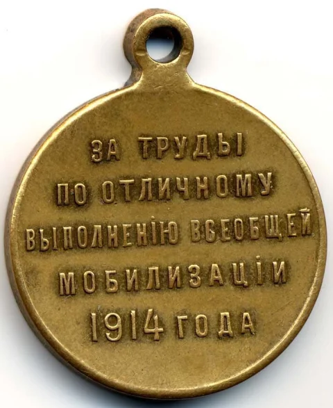 Медаль "За труды по отличному выполнению всеобщей мобилизации 1914 года" была учреждена в феврале 1915 года императором Николаем II. Она стала последней наградой русской монархии. Награда жаловалась всем лицам, которые принимали участие в работе по проведению мобилизации.