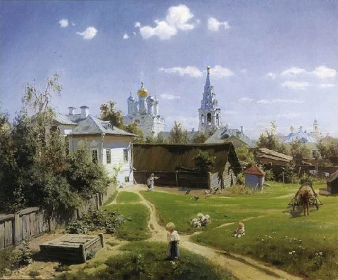 На картине "Московский дворик" изображена церковь Спаса на Песках, она сохранилась до наших дней, в одном из арбатских переулков. А в том месте, где художник писал свою картину, сейчас проходит Новый Арбат. Василий Дмитриевич был совершенно уникальным человеком, имеющим не только талант гениального пейзажиста, а и дар архитектора, музыканта, сочиняющего музыку и играющего на клавишных инструментах, скрипке и аккордеоне; артиста и режиссера собственного театра, талантливого педагога.