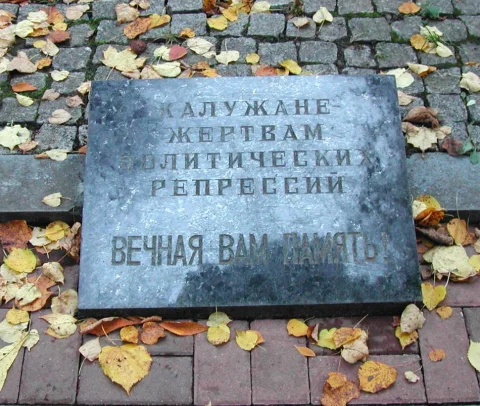 Рядом надпись: «Калужане - жертвам политических репрессий Вечная вам память!». Памятник возведен по инициативе депутата Законодательного Собрания Калужской области Ю. И. Зельникова, председателя правления Калужской ассоциации жертв политических репрессий Н. Мониковской и Эллы Памфиловой.