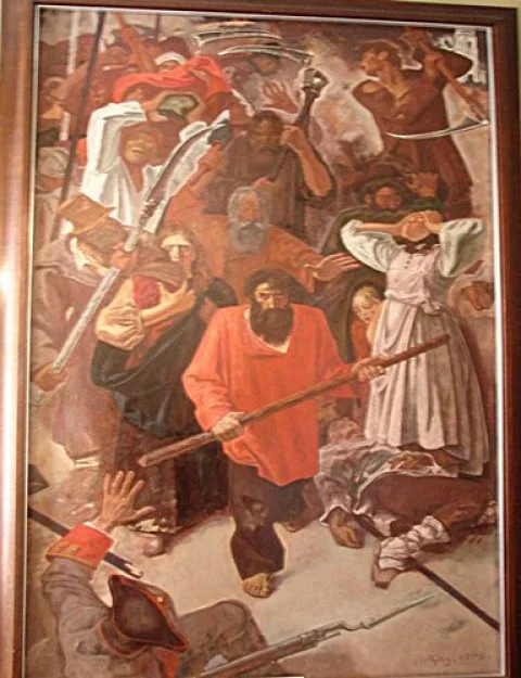 «У них были ножи, и многие ходили в гренадерских шапках...». Крестьяне, напав на полицейских, разбили их и отняли пушки. Для усмирения восставших пришлось послать бригадира Хомякова с тремя армейскими полками.