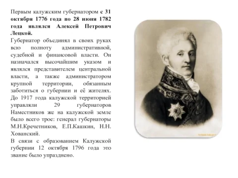 Алексей Петрович Лецкой был первым гражданским губернатором Калужского наместничества.