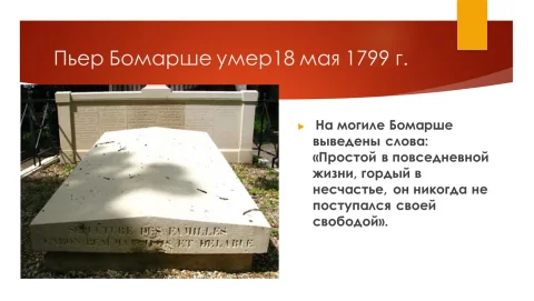 Умер Пьер Бомарше в Париже от инсульта 18 мая 1799 года в возрасте 67 лет.