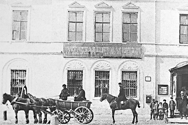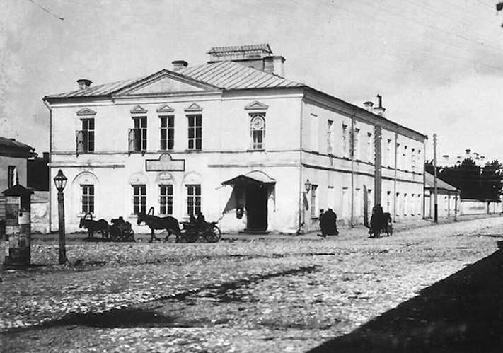 Около здания на фото видны мужики на возах и верхом.