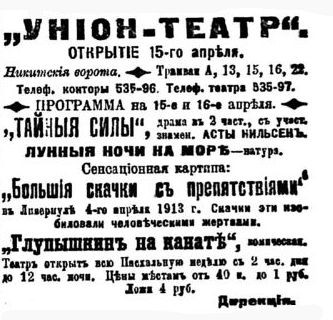 Как писала в то время калужская газета: «Театр "Унион" работает все время превосходно. В выборе картин обнаруживается большой вкус. "Гибель Помпеи" проходила здесь при полных сборах..."