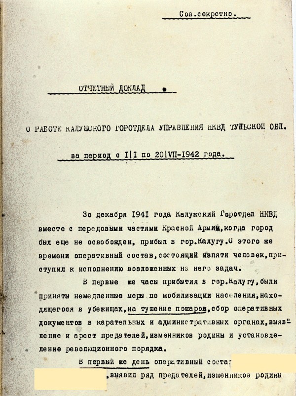 30 декабря 1941 года Калуга была полностью освобождена от фашистов, и вместе с солдатами Красной Армии пришли и чекисты. Об их работе в городе говорится вот в этом документе под грифом "Совершенно секретно".