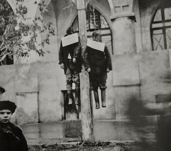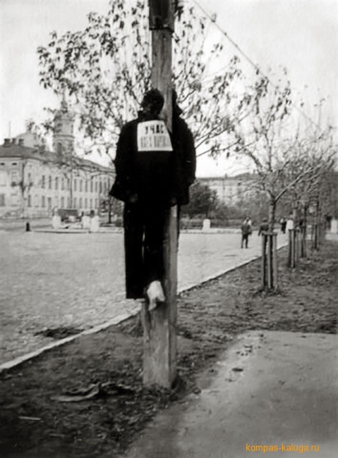 В архивных документах о зверствах и разрушениях в Калуге, причиненных фашистскими оккупантами, засекреченных в течение долгих лет, говорится: "Со вступлением немцев в город на деревьях были повешены 4 человека с надписями "партизаны", а 9 ноября на базарной площади были расстреляны 20 человек"...