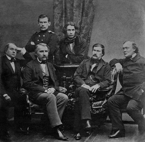 Сидят (слева направо): И. Гончаров, И. Тургенев. Стоит слева Л. Толстой.