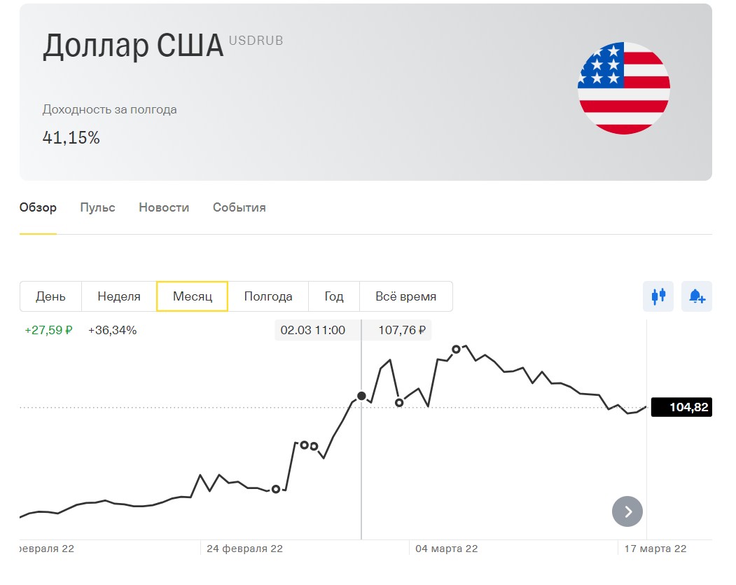 05 марта курс $ подскочил где-то до 150, но быстро упал до 120.С тех пор идёт постоянное снижение курса. В пятницу застабилизировался и курс составил 104,82 руб. за 1 зелёный $.